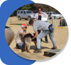 stranger, with the dog sitting at the handler’s side, the